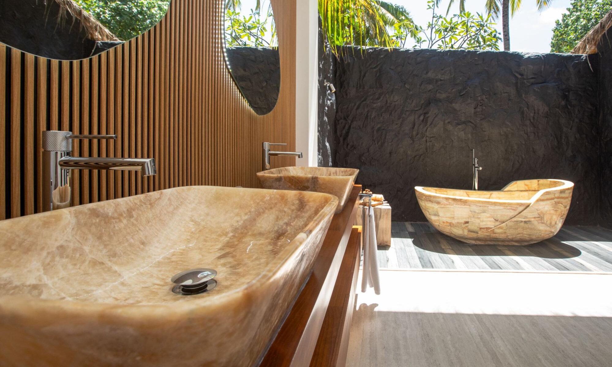 Spanning 180 sqm across two levels, this spacious suite offers a lush, tropical courtyard garden with a private pool, just a few steps from the lagoon. Inside, natural textures, warm woods and curated furnishings evoke a sense of refined luxury and mindful comfort. Three ensuite bedrooms, a generous living area and a kitchenette with dining space invite connection with loved ones.